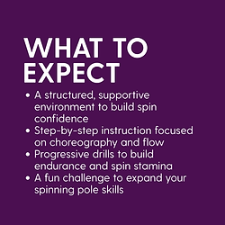 This 4-week course is designed for students ready to focus on dancing on a spinning pole. Learn to control momentum, manage dizziness, and move with intention through choreography on an ever-moving pole. Prerequisite: Completion of Pole Fun-damentals 3 or equivalent spinning pole experience recommended. What You’ll Learn: Techniques to control and regulate spin momentum Drills to manage and reduce dizziness How to link movements and transitions on a spinning pole A complete spinning pole choreography routine What to Expect: A structured, supportive environment to build spin confidence Step-by-step instruction focused on control and fluidity Progressive drills to build endurance and spin stamina A fun challenge to expand your spinning pole skills What to Wear: Comfortable pole attire (shorts and a fitted top for grip) What to Bring: Water bottle Pole grip (recommended) A positive attitude and readiness to focus Get ready to build your skills and explore a new dimension of flow!