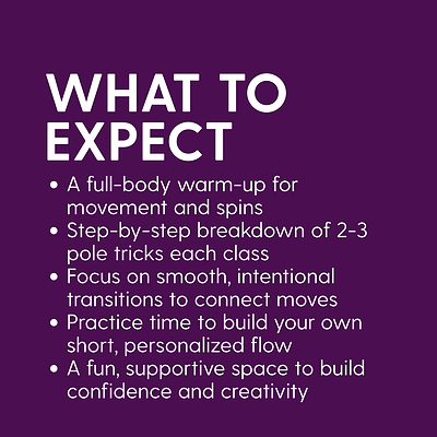 This class is suggested for students who have completed Pole Fun-damentals 1 & 2 or have comparable experience.Learn how to link pole tricks into seamless, fluid sequences in Tricks & Flow! This class focuses on learning 2-3 new pole tricks and exploring multiple ways to transition between them, helping you build cohesive and stylish combinations. What to Expect: - A full-body warm-up to prepare for movement and spins - Step-by-step breakdown of 2-3 pole tricks each class - Focus on smooth, intentional transitions to connect moves - Practice time to build your own short, personalized flow - A fun and supportive space to build confidence and creativity What to Bring: - Shorts and a tank top or sports bra for grip - Knee pads (encouraged, but not required) - Pole grip (encouraged, but not required) - Water bottle Perfect for students who know individual tricks but want their movement to feel more connected and expressive!